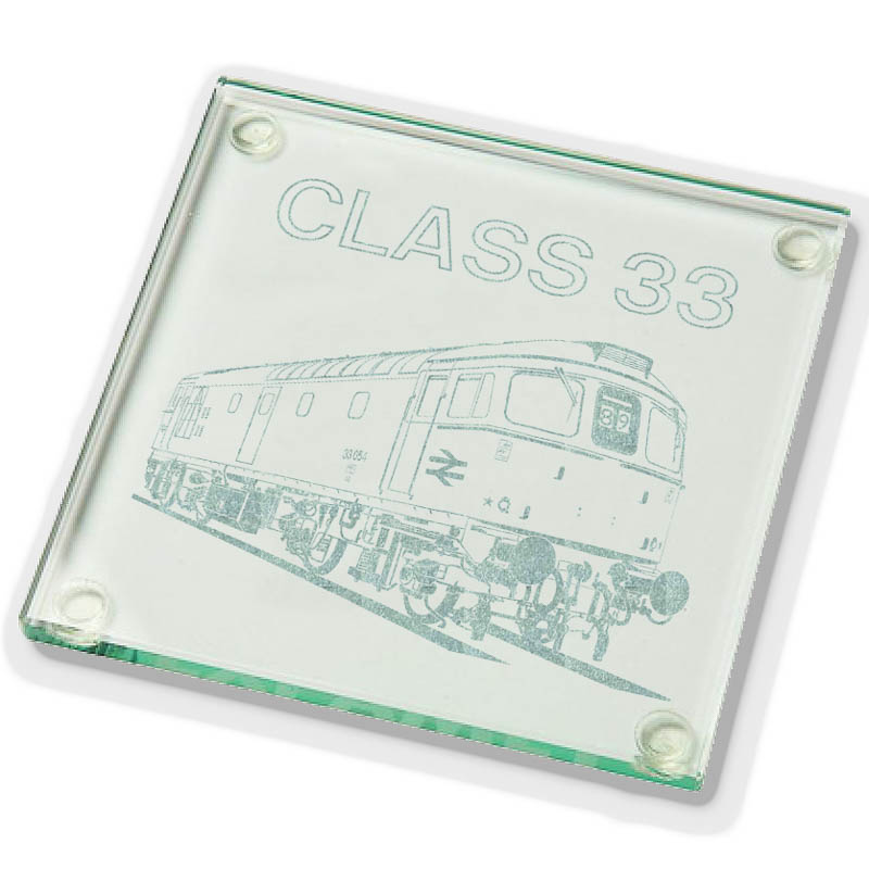 A 10cm x 10cm laser etched Glass coaster featuring a dynamic Class 33 design.